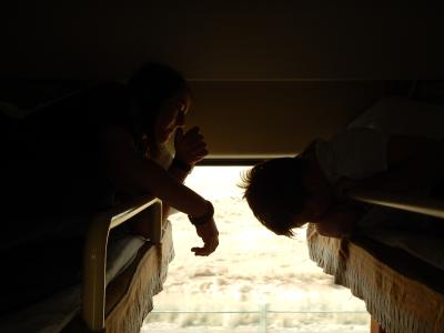 In der Tibet-Bahn haben wir einen 4 personen Softsleeper nur für uns, trotzdem ist es eng. Und auch die erwarteten Kopfschmerzen aufgrund der Höhe stellen sich langsam ein, lassen sich aber mit Tabletten eindämmen.