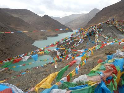 Auf dem Weg dahin kommen wir am heiligen Yamdrok-See vorbei, hier auf fast 5000 m Höhe ist es trotz Sonne kalt und windig, ein kleiner Vorgeschmack auf das, was uns noch erwartet. Und auf jedem Gipfel sind tausende Gebetsfahnen gespannt - je näher dem Himmel, desto besser.