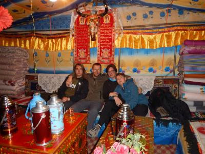 Da die Jurte hier nur zum Feiern genutzt wird, bekommen wir Zelte, deren Aufstellen sich aber aufgrund des Windes als schwierig erweist.