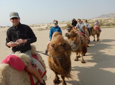 Nach einem tendenziell sehr chinesischen Frühstück gehen wir alle zum Kamelreitenund streifen Karawanenmäßig durch die Wüste.