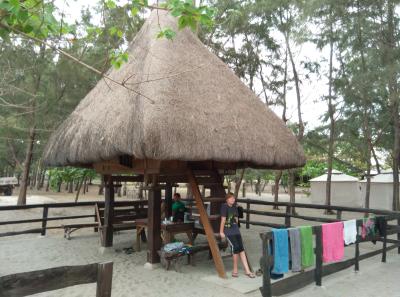 Hier ist der Chystal Beach Resort unser Ziel. Der Resort direkt am Strand setzt sich aus Campingplatz, Zelten Hütten, Baumhäusern uns Häusern verschiedenster Art zusammen. Als auslädische Touristen werden uns natürlich erst mal die teuersten Unterkünfte gezeigt, die Beach Cabin mit 10??? Betten ??? Dann folgen weniger charmante Vierbettzimmer, wir haben aber mittlerweile ein Auge auf die Hütten geworfen.